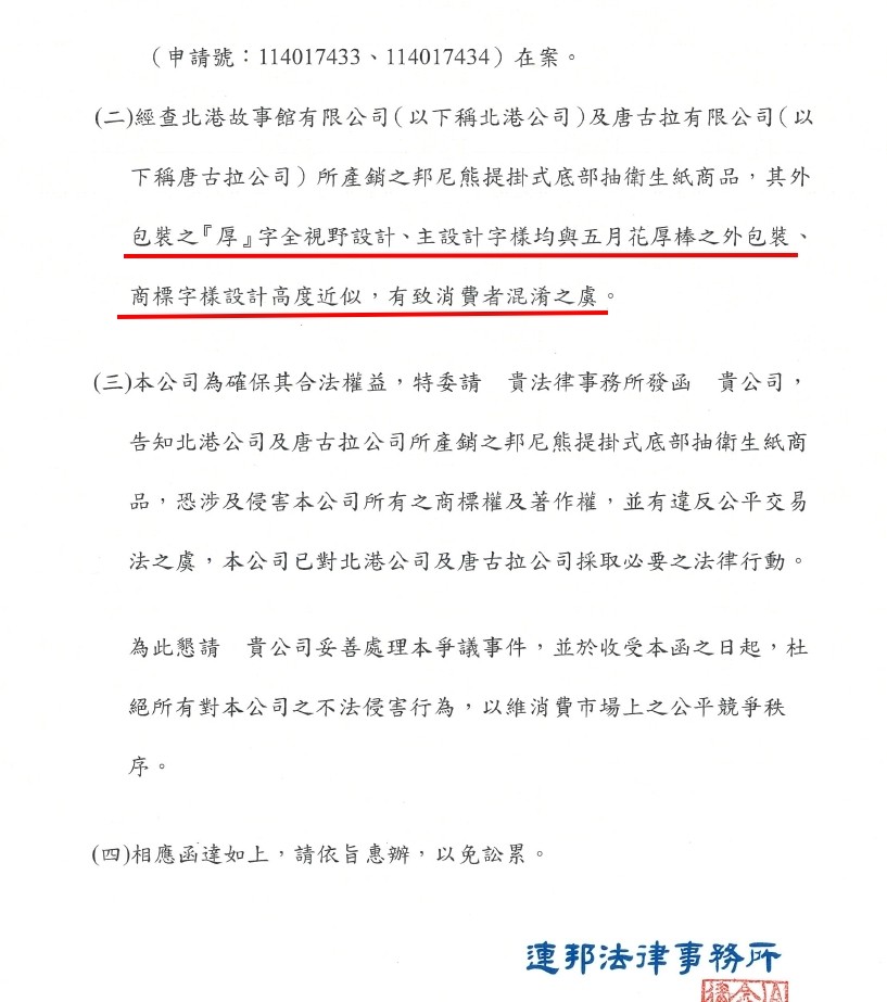 被指控的是北港唐古拉公司,業者說,對方的商標今年三月送審,還在審議階段,哪來的侵權?甚至反控大廠,疑似冒用擁有專利的三孔,提掛式紙品設計,還秀出專利,大廠律師函曝光,認為唐古拉產品外包裝,厚字全視野設計、主設計字樣,均與五月花厚棒之外包裝,商標設計字樣高度近似,有致消費者混淆之虞。其實市售衛生紙的外包裝,出現厚字,相當常見這裡厚那裡也厚,產品只是想強調衛生紙的厚度,對於事件,永豐餘也有回應,註冊厚字商標,發函只是提醒,希望對於商標爭議,能妥善處理。