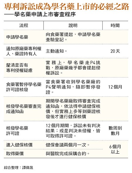 因為根據現行制度,走P4途徑的學名藥證申請者,只要遞交「藥品專利狀態之聲明表」,接著收到食藥署核發的資料齊備函後,就得在20天內,將敘明藥品未侵權或新藥專利應撤銷的理由,通知專利權人(國際藥廠);只要專利權人認為有侵權疑義,向法院提起侵權訴訟,並通知食藥署。食藥署得知侵權訴訟發生後,就會暫停核發藥證12個月。