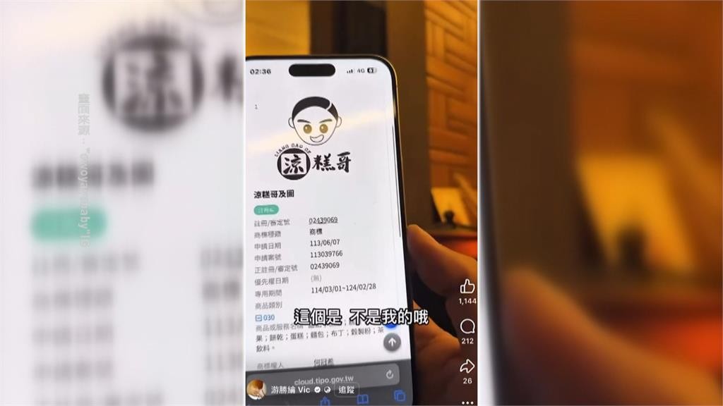 涼糕業者游勝綸說:「我把鏡頭轉到另外一邊,給你們看一下手機,然後我來問一下你們。」經營生意10多年了,但前陣子發現涼糕哥這稱號,已經被註冊商標。涼糕業者游勝綸說:「這個是...,不是我的(商標)喔不是我的,他叫涼糕哥他註冊了這個商標。」到底誰才是涼糕哥?游先生靠著好口碑,IG粉絲突破9萬人,現在卻因為這個糕,跟另一家業者差點互告,游先生認為對方明明有店名,怎麼還要用涼糕哥去註冊商標?涼糕業者何先生解釋:「當初申請這個商標,是用我小孩子的名字,因為我自己的名字跟太太的名字,都已經有另外的商標了,這個商標圖像其實很清楚,它並不是用游先生的臉那就是我的臉,一個油頭的臉雖然人家說醜醜的。」